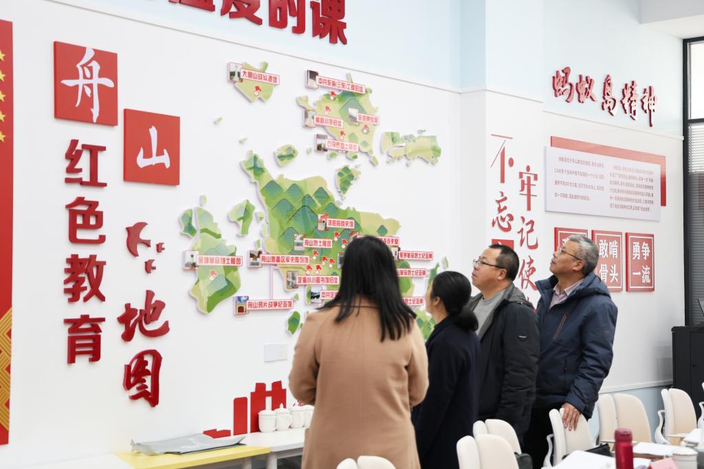 1月8日,新落成的舟山市大中小学思政教育一体化基地,迎来了舟山群岛第一批参观者。在董浩云图书馆二楼,外墙基地走廊上以图文简介了基地概况,基地教室的左侧展陈舟山红色教育地图和蚂蚁岛精神,右侧排列着红船精神、井冈山精神、延安精神等中国精神谱系,直播和录播设备设施一应俱全。前来参加2025年度舟山市大中小学思政教育一体化建设研讨会的各县区教育局负责人和大中小学思政教育一体化建设智库专家代表,对这个思政智慧教学平台给予了高度肯定。