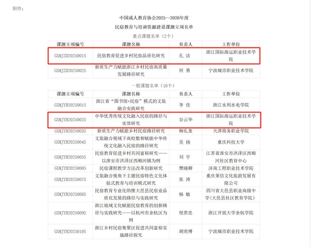 近日,中国成人教育协会公布了2025—2026年度民宿教育与培训资源建设课题立项名单,我校共有2项课题获批立项。其中,孔洁老师主持的课题《民宿教育促进乡村民宿品质化研究》被立为重点课题;谷云华老师主持的课题《中华优秀传统文化融入民宿的路径与实效研究》被立为一般课题。