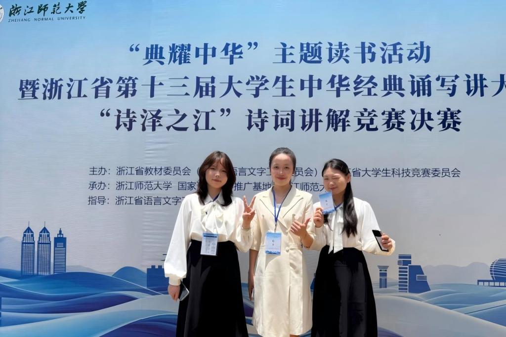 为深入学习贯彻习近平文化思想,贯彻落实习近平总书记关于教育的重要论述和关于语言文字工作的重要指示批示精神,传承弘扬中华优秀传统文化,增强青年文化自信,由浙江省教材委员会(浙江省语言文字工作委员会)、浙江省大学生科技竞赛委员会主办,浙江省语言文字工作者协会指导的“典耀中华”主题读书活动暨浙江省第十三届大学生中华经典诵写讲大赛近日陆续在湖州师范学院、浙江师范大学、绍兴文理学院举行,全省100多所高校的1000多名大学生参与角逐。我校青年学子在本次大赛中共获一等奖3项,二等奖7项,三等奖6项。