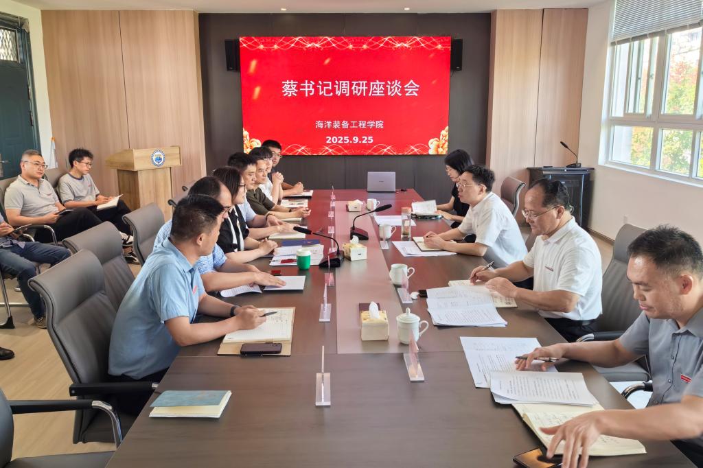 9月25日,校党委书记蔡志军到海洋装备工程学院走访调研,党委副书记孔志光,教务处、办公室等部门负责人陪同。海洋装备工程学院行政班子、专业团队长(负责人)骨干教师等参加座谈会。