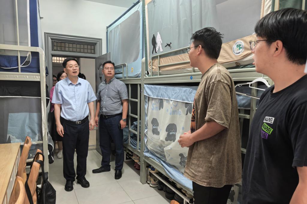 蔡志军书记一行深入学生寝室,与留校学生亲切交流,仔细倾听学生假期安排和学习、生活情况,叮嘱大家科学规划时间,兼顾学业与身心健康,合理安排作息与锻炼。