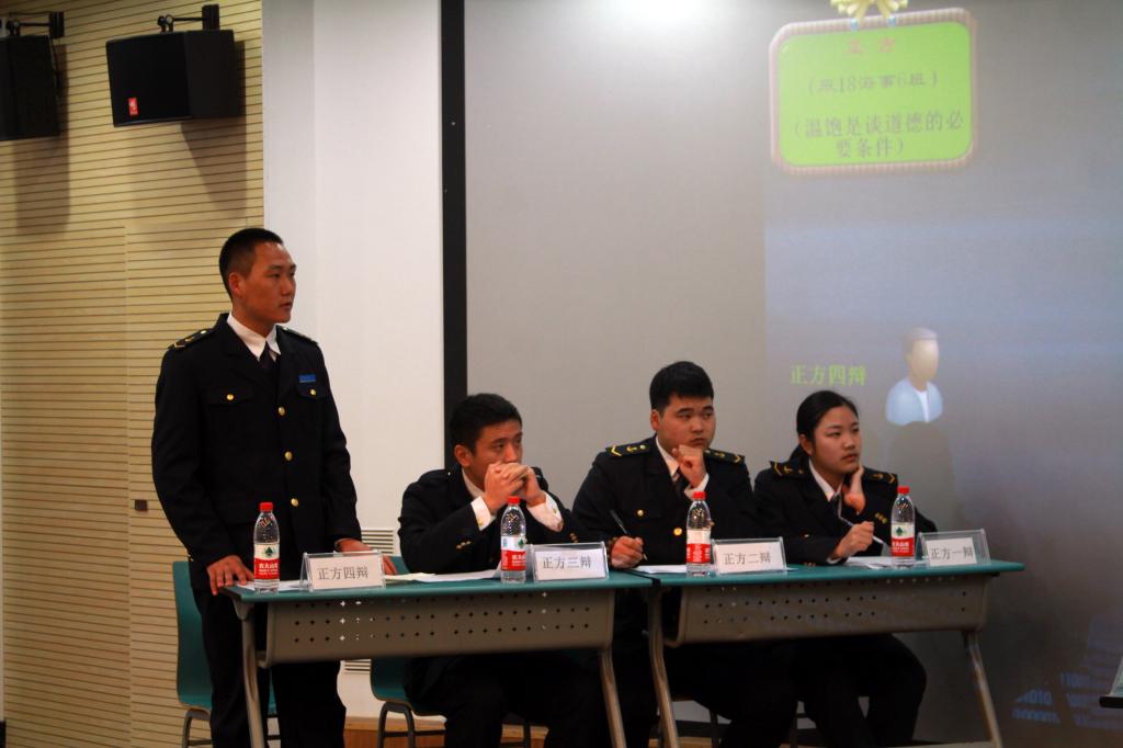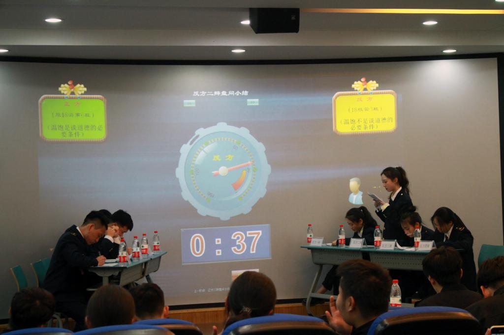 比赛围绕“温饱是否是谈道德的必要条件”为辩题,通过“开篇立论”、“正反攻辩”、“自由辩论”、“总结陈词”、“评委点评”五个环节进行。赛场气氛紧张激烈,双方队员以敏捷的思维、流利的陈词展开唇枪舌剑,你来我往,却又不失风度,引来观众掌声阵阵。