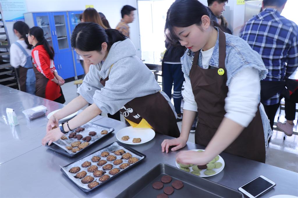 在4102实训室进行的西点制作比赛现场,选手们拿起各自需要的器具和材料,大家有条不紊,按照步骤操作,从称量到打发,从揉捏到装盘,选手们不敢在任何一个步骤出错。随着时间一分一秒的消逝,选手们也从烤箱中拿出自己满意的作品,开始精致地摆盘。经过评委老师严谨的评定,最终,由2018及国际邮轮乘务管理7班的俞翼辰和李禹柯同学获得一等奖。