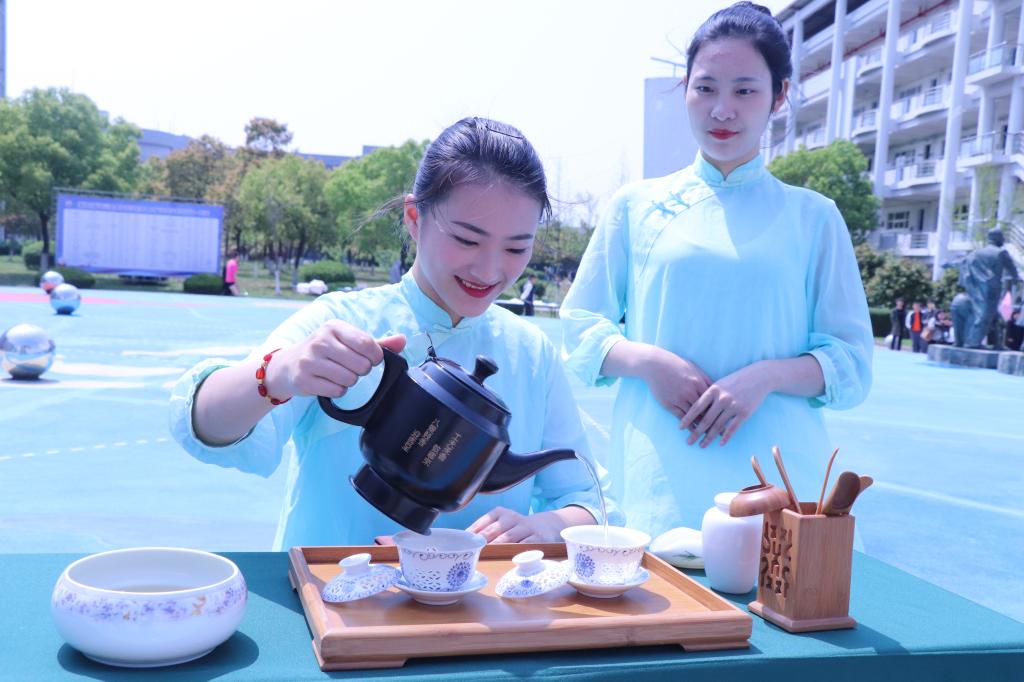 在董浩云广场进行的茶艺展示中,同学用木勺舀上茶叶放进盖碗,用旁边壶中烧开的水淋过,蒸汽携带着茶香袅袅上升。心在茶烟中渐渐沉淀,一种久违的熟悉感涤静了胸中的苍凉,脑海一片空宁。沸水反复相沏,而后倒进瓷碗中,以大拇指、食指、中指,呈“三龙护鼎”,力道轻缓柔匀地端起青瓷,不破茶魂。青瓷托于掌心,几片茶叶在清澈碧绿的液体中舒展,旋转,徐徐下沉,再升再沉,三起三落,芽影水光,相映交辉,泡制出一杯好的茶。茶艺展示是为了让参加开幕式的师生可以零距离的观赏、品鉴茶文化,给师生在骄阳下带来一抹清凉。