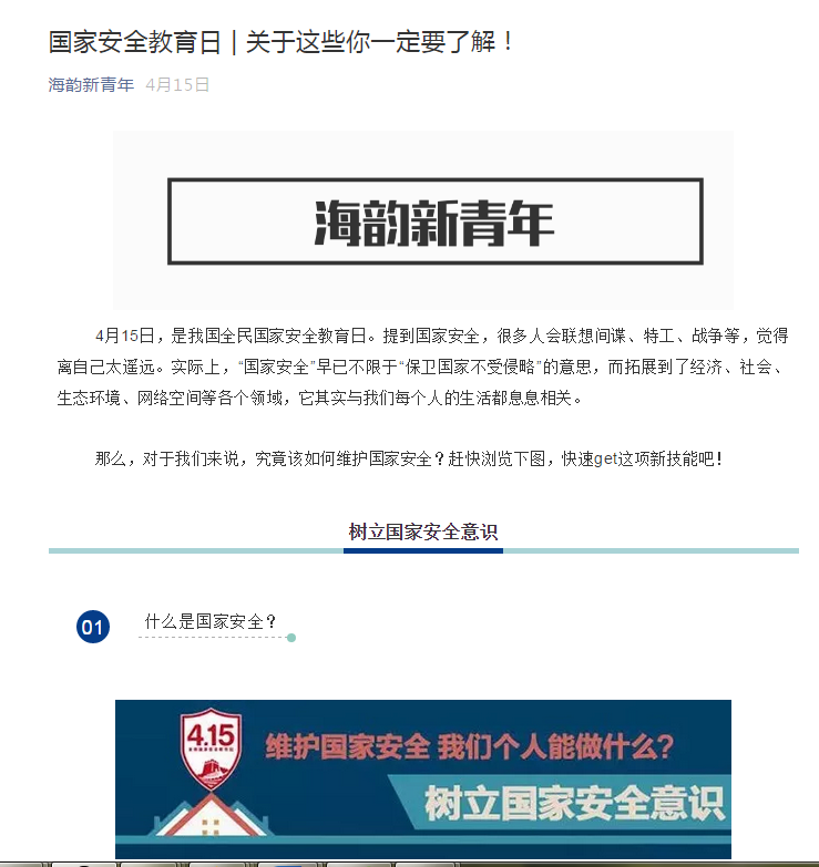 活动中,各相关部门、二级学院充分利用微信、微博等网络媒体,结合LED屏、黑板报等传统媒体,以会议、主题班级活动等形式开展“全民国家安全教育日”活动。活动主要传达了今年“全民国家安全教育日” “国家安全 人人有责”的内容,观看了微电影《微信陷阱》、小视频《谁是网络间谍受害者》等影视材料,学习了“全民国家安全教育日”的由来、《反间谍》宣传手册等图文材料。