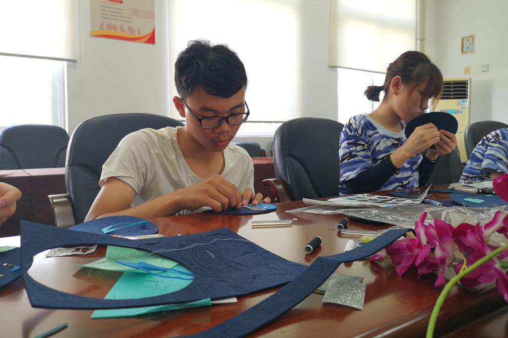 活动开始前,同学们自行组队,领取DIY材料和道具。大家按照步骤制作着星月墙挂,并相互交流制作方法和技巧。有的同学还在作品中加了自己的小创意,引得其他同学刮目相看。
