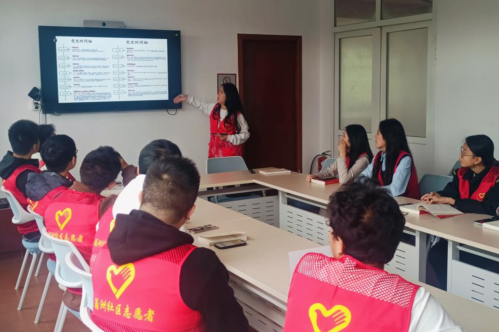 在翁洲社区会议室里,工作人员首先带领志愿者们一起按照党的重大历史事件时间轴重温了党的历史进程。一寸山河一寸血,一抔热土一抔魂。从“星星之火”到“燎原之势”,从“一叶红船”到“巍巍巨轮”。从南昌起义的第一声枪响,到抗日战争的烽火连天,再到新中国成立。这些重大历史事件的背后,正是革命先辈们用鲜血和生命铺就了今天的和平与繁荣。