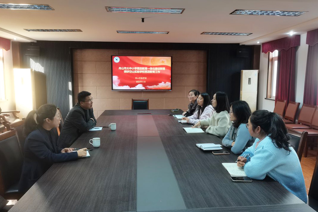 为贯彻2024年全国教育大会精神和推进“真理的味道”在舟山行动,11月27日,舟山市大中小学思政课一体化建设指导委员会副主任、市大中小思政教育一体化基地(联盟)秘书长郑忠义和我校马克思主义学院副院长徐徐一行调研走访了岱山县教育局、岱山实验学校、岱山中心小学。