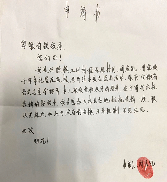 “我是周启凯……深受党和政府的培养,在当前抵抗疫情的战役中,我自愿加入抵抗疫情一线,服从党组织和地方政府的安排,不计报酬,不论生死!”落款按下红手印,分外夺目。鲜红手印背后是一颗年轻又炽热的心。