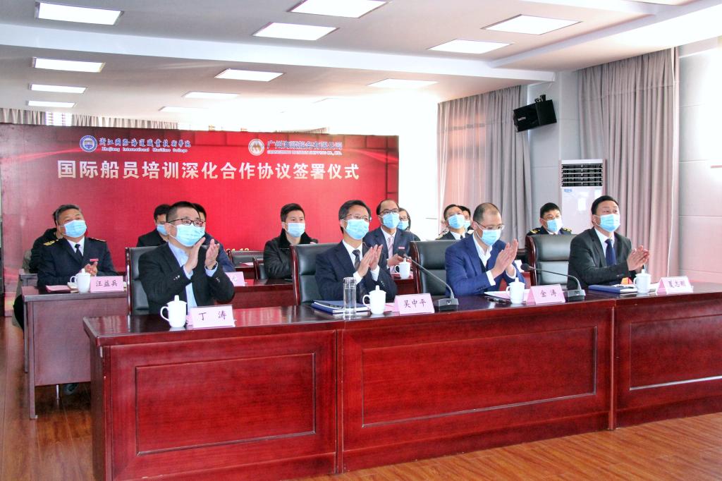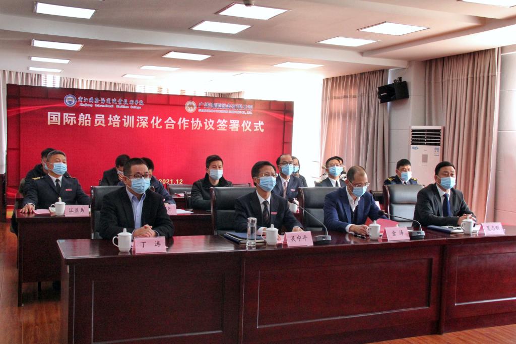 在与会人员的共同见证下,浙海职院与广州海顺船务有限公司共同签署了国际船员培训深化合作协议。