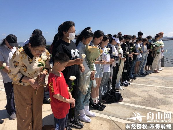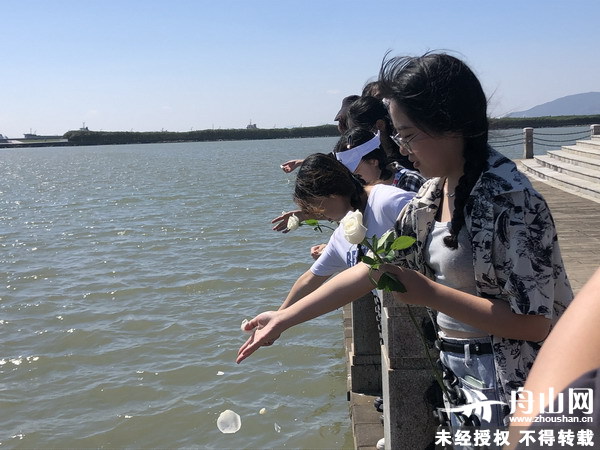 活动最后,一瓣瓣白色的鲜花撒向揽月湖,以此悼念“里斯本丸”沉船中的战士英魂。逝者已矣,而今人也将铭记历史,更加珍惜和平。